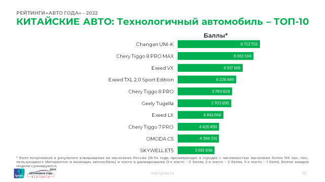 Одним из трех основных сегментов исследования стал раздел «Китайские авто». Автомобили из КНР стремительно завоевывают российский рынок. Но для многих потребителей они все еще недостаточно хорошо знакомы. Респондентам нужно было выбрать лучшие китайские автомобили на российском рынке в четырех категориях: «Лучший технологичный», «Лучший многоцелевой», «Лучший семейный автомобиль» и «Лучший внедорожник».